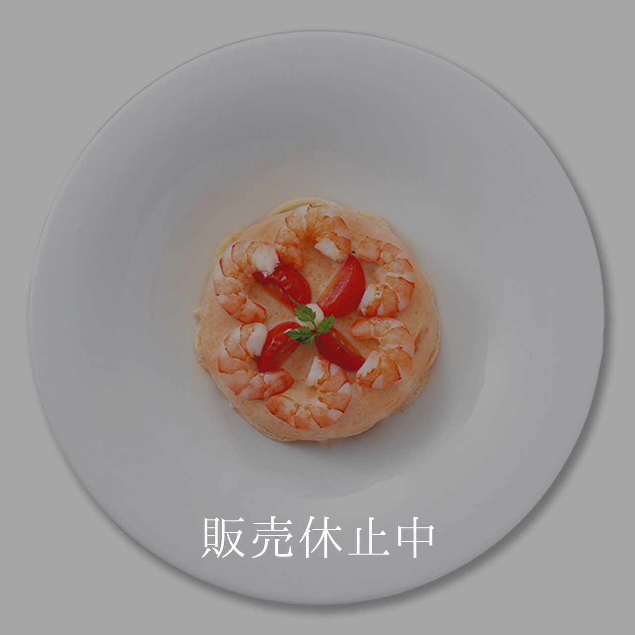 海老の旨味が溶け込んだトマトクリームソースに、6匹の海老をレース編みのようにきれいにデコレーションした、海老感たっぷりのパスタケーキ『可憐な海老のレース』。