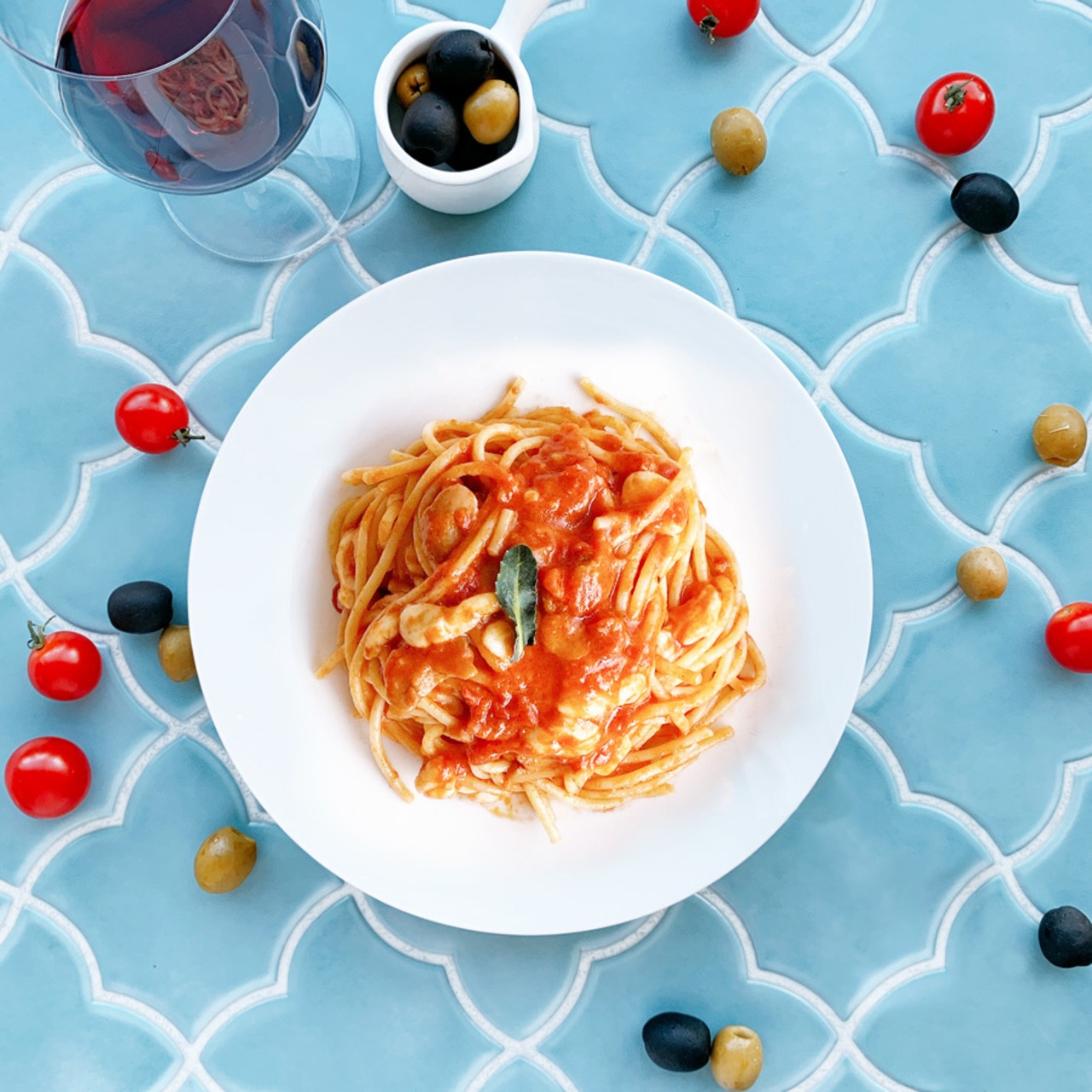 イタリア産<真珠のモッツァレラチーズ>をおしげもなく使った、完熟トマトで作った赤い赤いオリジナルトマトソースのパスタケーキ『赤と白の誘惑』。
