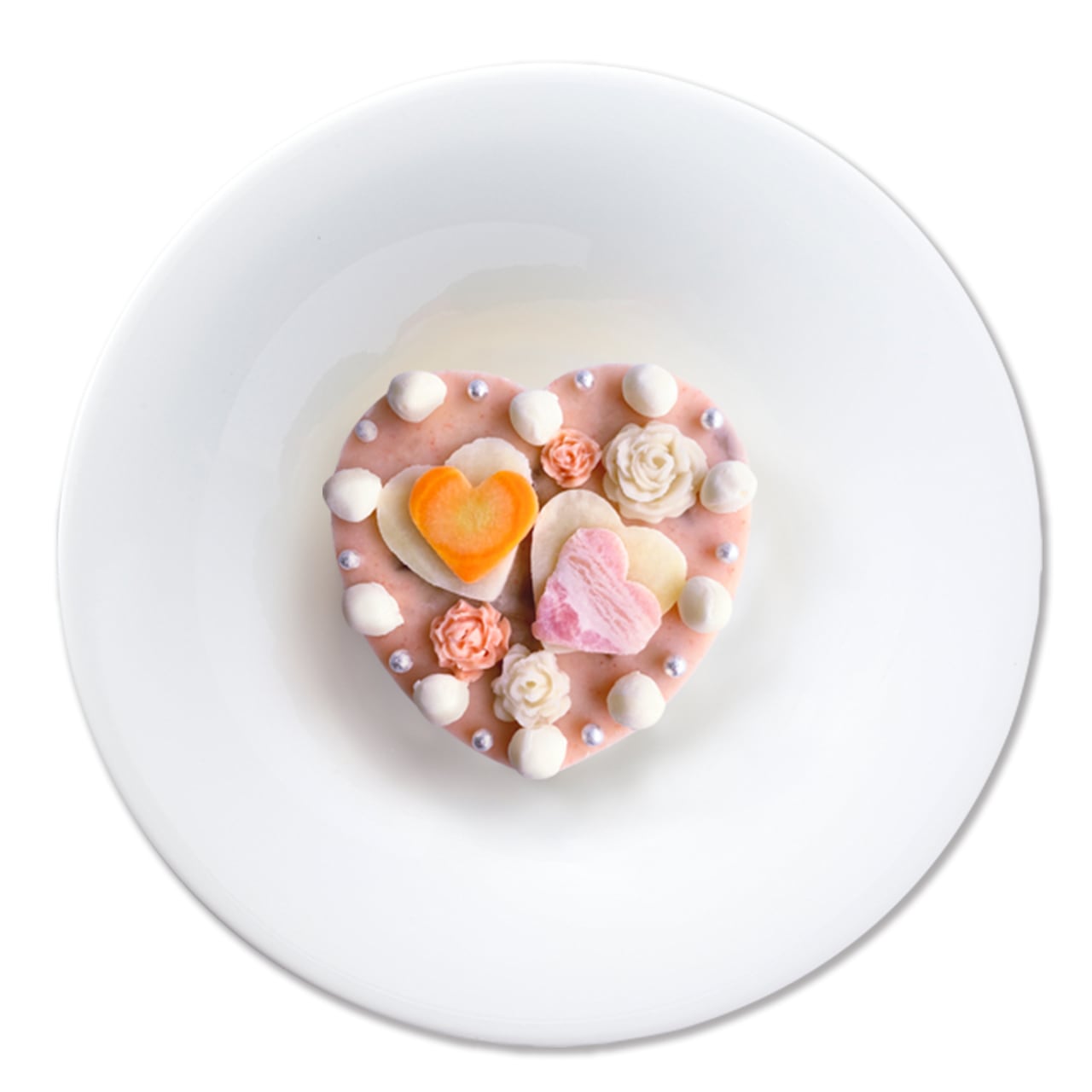 ピンクベースのハート型の中央に、<たらこクリームで作られたバラ>と<ハート>が散りばめられた、華やかなデザインのDecopaです。